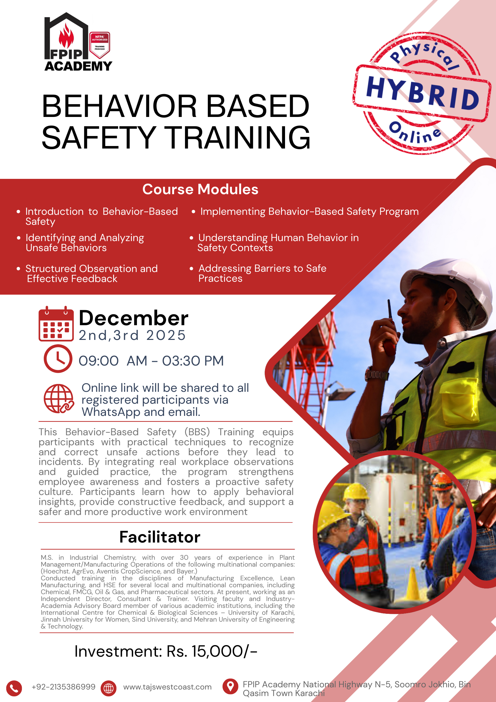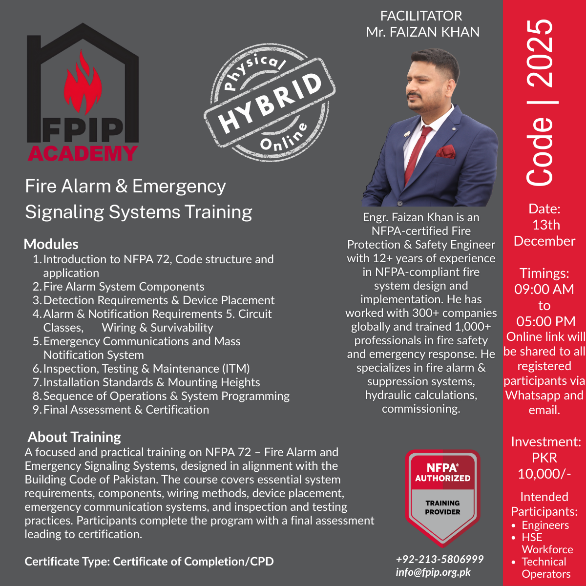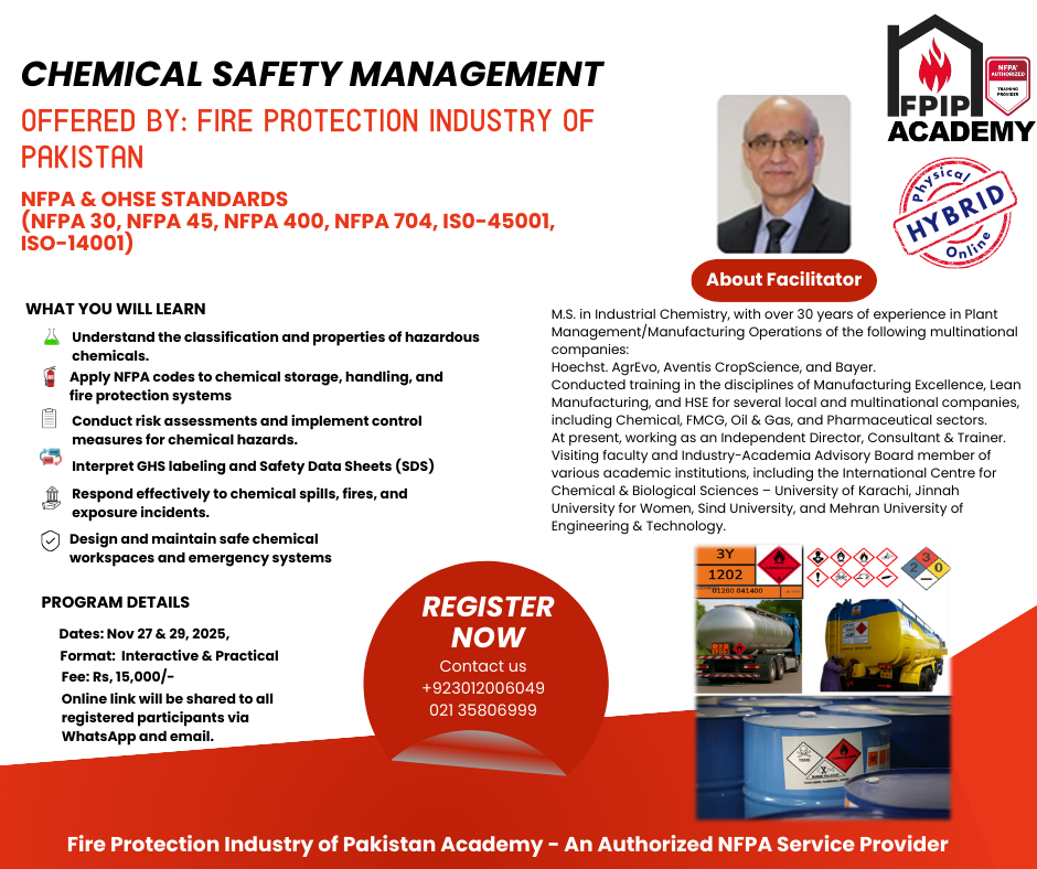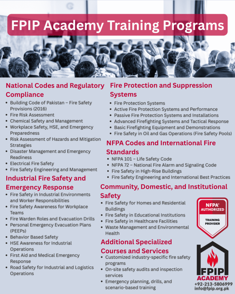 FPIP Academy plays a vital role in strengthening safety culture, professional competence, and community resilience across Pakistan. As the country continues to industrialize, expand its urban centers, and modernize its infrastructure, the need for trained professionals in fire protection, health and safety, emergency preparedness, and regulatory compliance has never been more significant. FPIP Academy responds to this national need by delivering structured, high-quality training that equips individuals and organizations with the knowledge and practical skills required to prevent incidents, protect lives, and safeguard property.